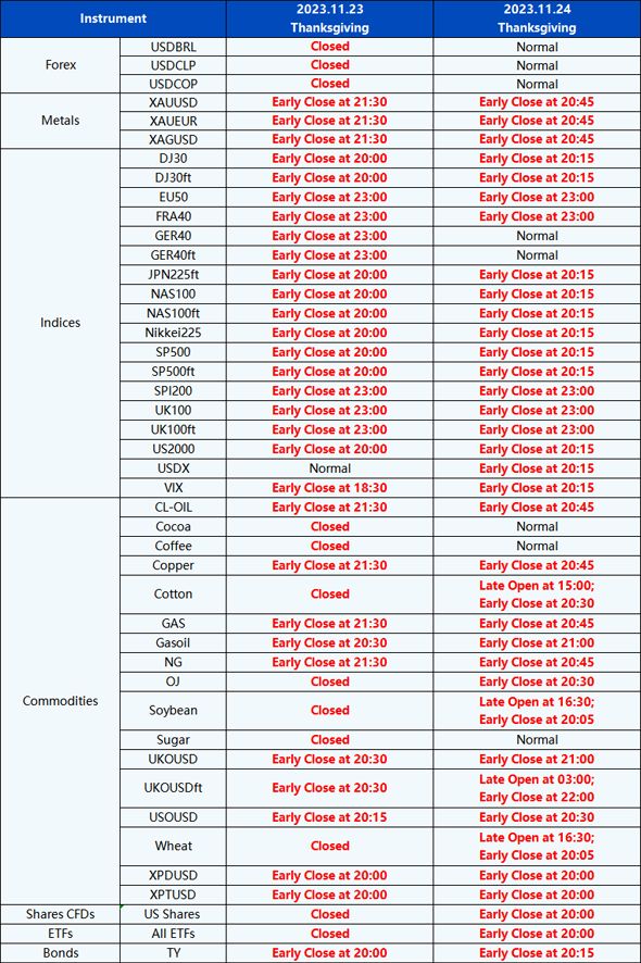Please be advised that the following instruments’ trading hours and market session times will be affected by the upcoming Thanksgiving holiday.