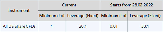 Please be advised that the minimum lot of opening order and leverage on all US Share CFDs products will be adjusted starting from 28th February 2022 to further optimise the competitiveness and improve the trading environment.