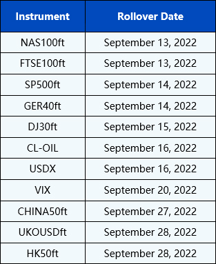 Please be advised that the following CFD instruments will be automatically rolled over as per the dates in the table below. As there can be a pricing difference between old and new futures contracts, we recommend clients to monitor their positions closely and manage positions accordingly.