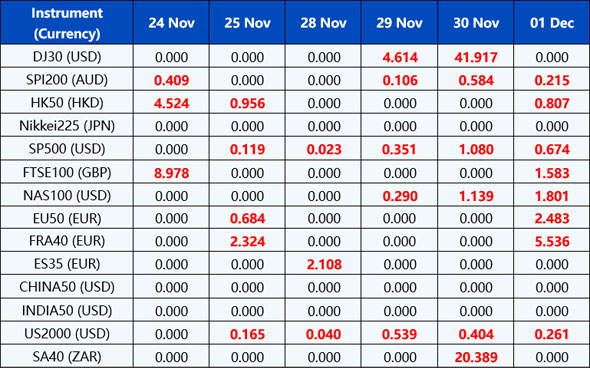 Please be advised that the dividends of the following index CFDs will be adjusted by upcoming ex-dividend dates. The comment for trading index CFDs will be in the following format “Div&<Product Name>&<Net Volume>” which show in the balance after the close of the day before the dividend payment date.